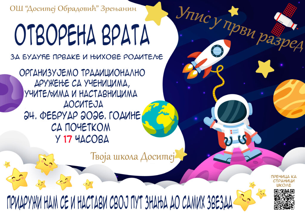 Osnovna škola Dositej Obradović poziva roditelje i buduće prvake na Dan otvorenih vrata škole, koji će se održati 24. februara 2026. godine u 17 časova.