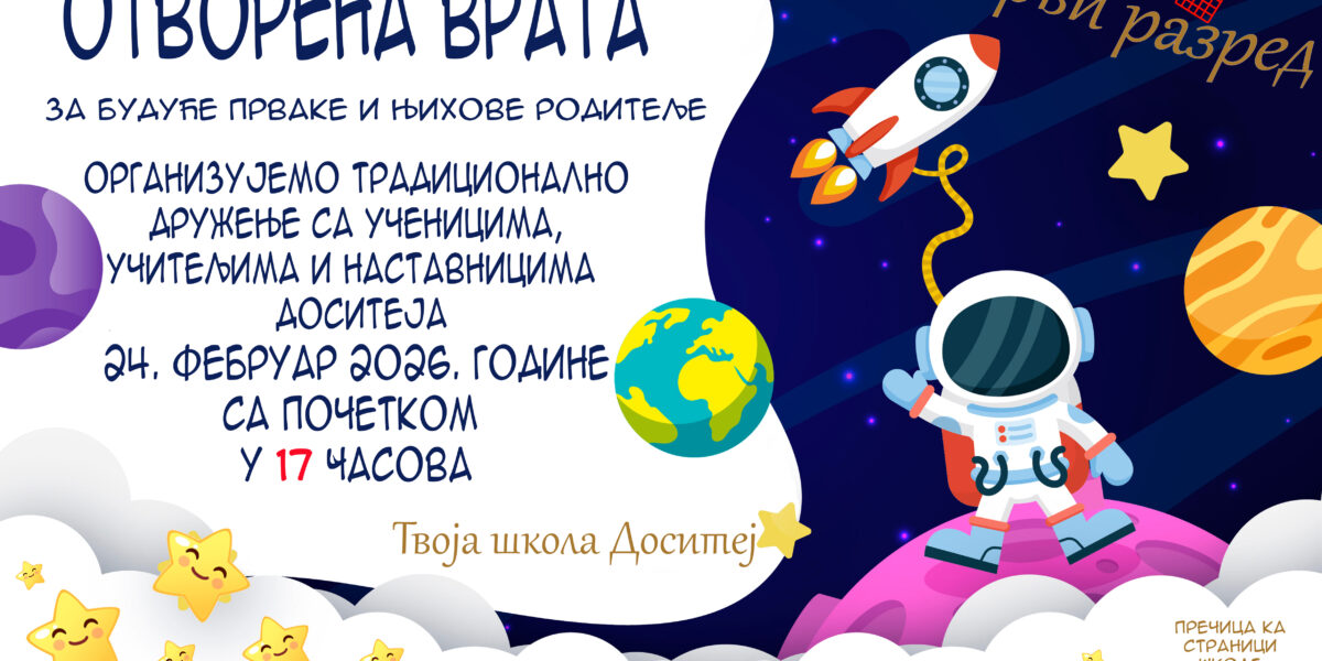Više informacijaOBAVEŠTENJE ZA RODITELJE BUDUĆIH PRVAKA Osnovna škola Dositej Obradović poziva roditelje i buduće prvake na Dan otvorenih vrata škole, koji će se održati 24. februara 2026. godine u 17 časova. Dobrodošli da upoznate školu, učitelje, prostor i način rada, kao i da dobijete sve potrebne informacije o upisu u prvi razred. Radujemo se vašem dolasku!